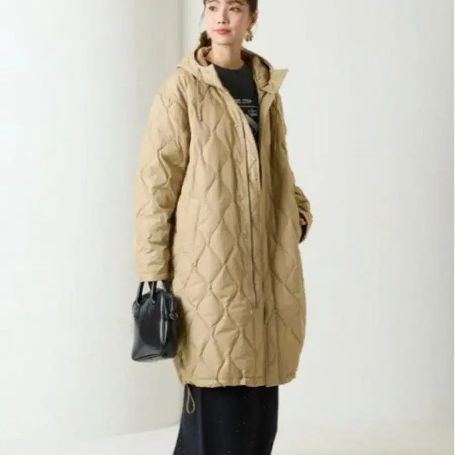 퀼팅 디자인의 베이지 롱 다운 자켓