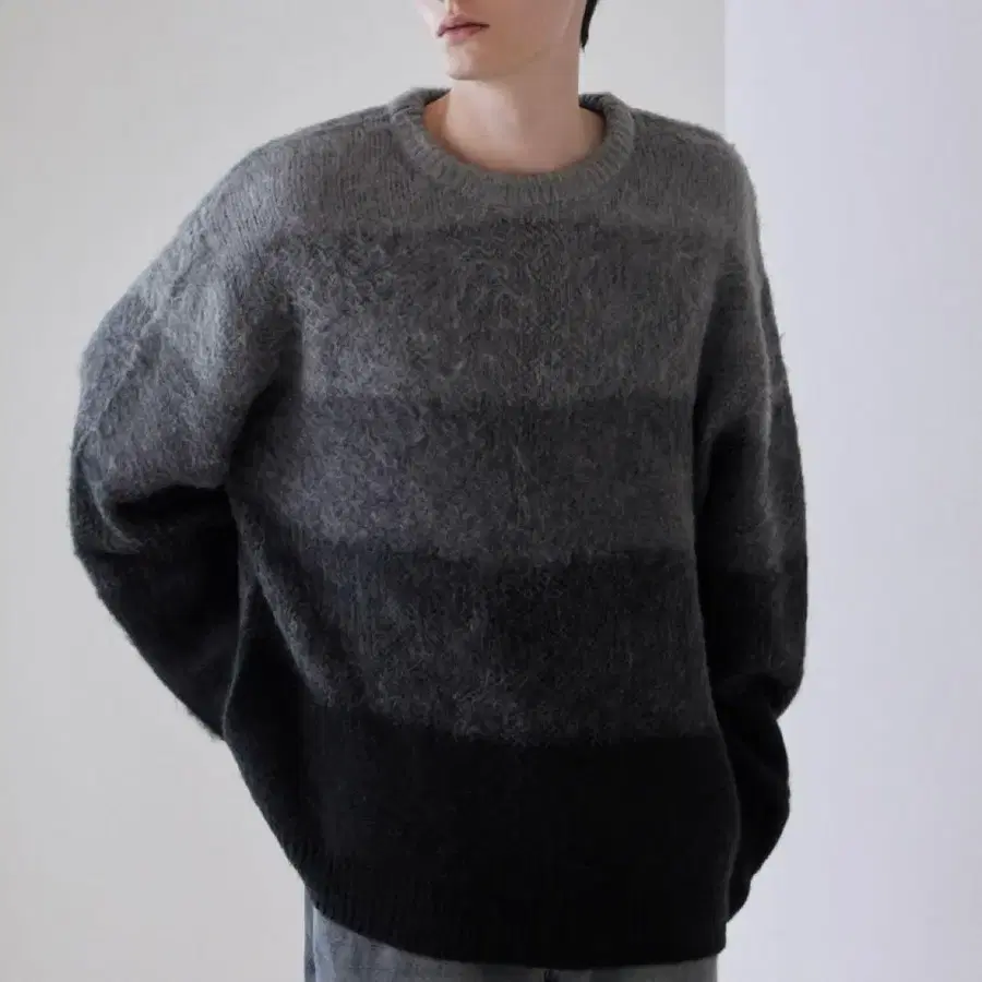 기모 가공으로 인한 포근한 샤기 느낌이 특징인 크루넥 니트.
