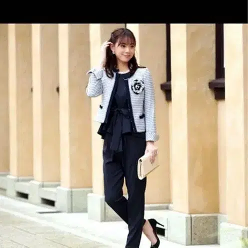 크롭 기장의 자켓에 테이퍼드 팬츠로 롱 레그 효과도 있으며, 깔끔한 스타일로 보여줍니다.