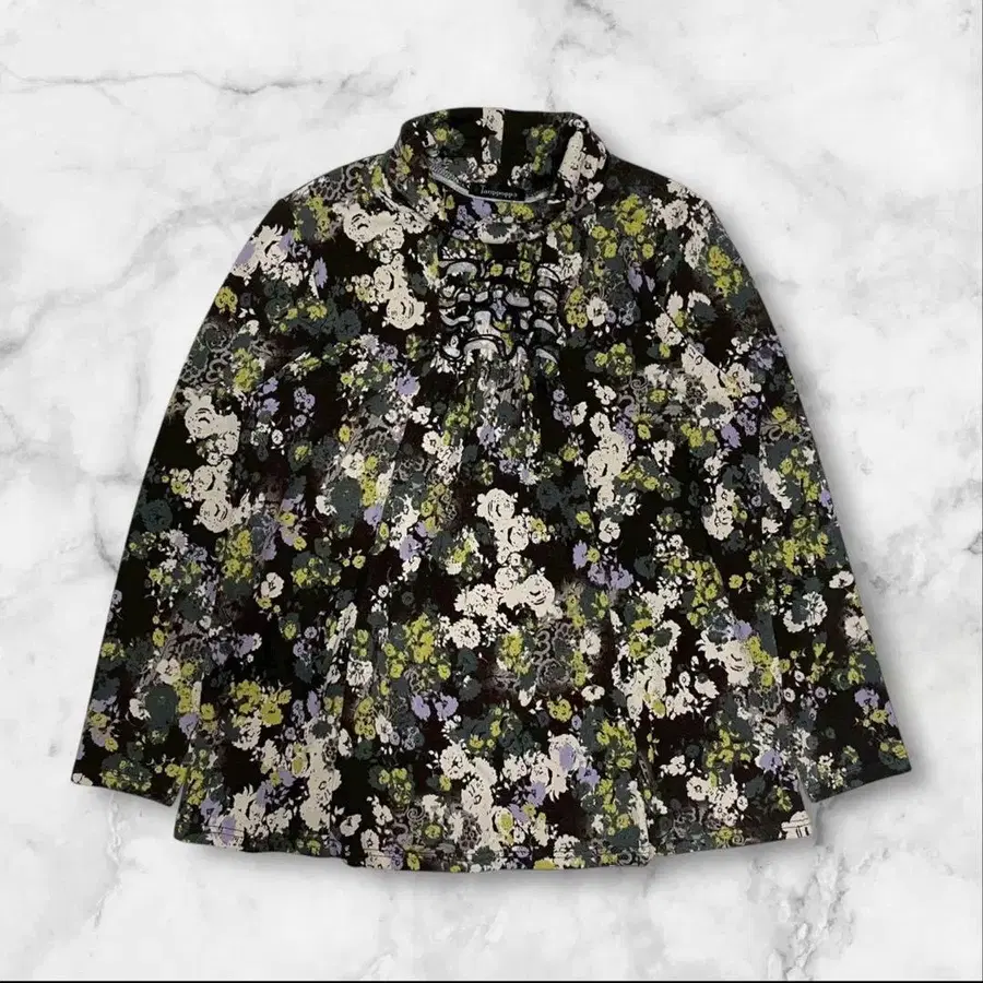 차분한 다크 베이스에 뉘앙스가 있는 꽃무늬가 돋보이는 하이넥 상의.