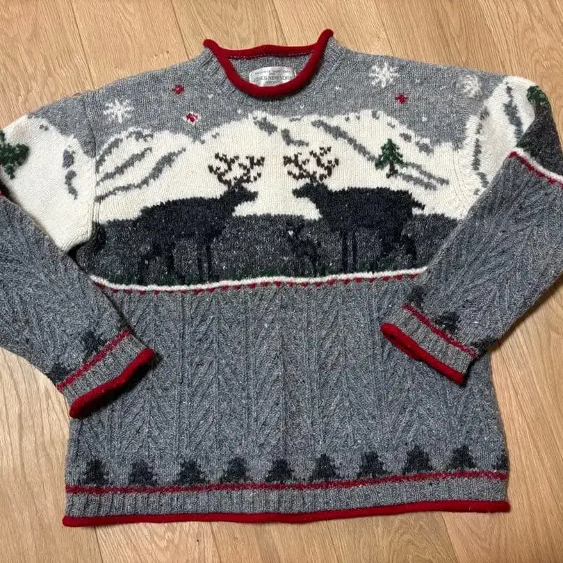 그레이와 화이트 베이스의 니트에, 눈꽃 결정, 어른 루돌프와 아이 루돌프 무늬가 새겨져 있으며, 뿔은 브라운, 목 부분과 소매, 밑단의 빨간색 포인트 컬러, 크리스마스 트리 그린 색상의 조합이 최고로 귀엽습니다 ♡