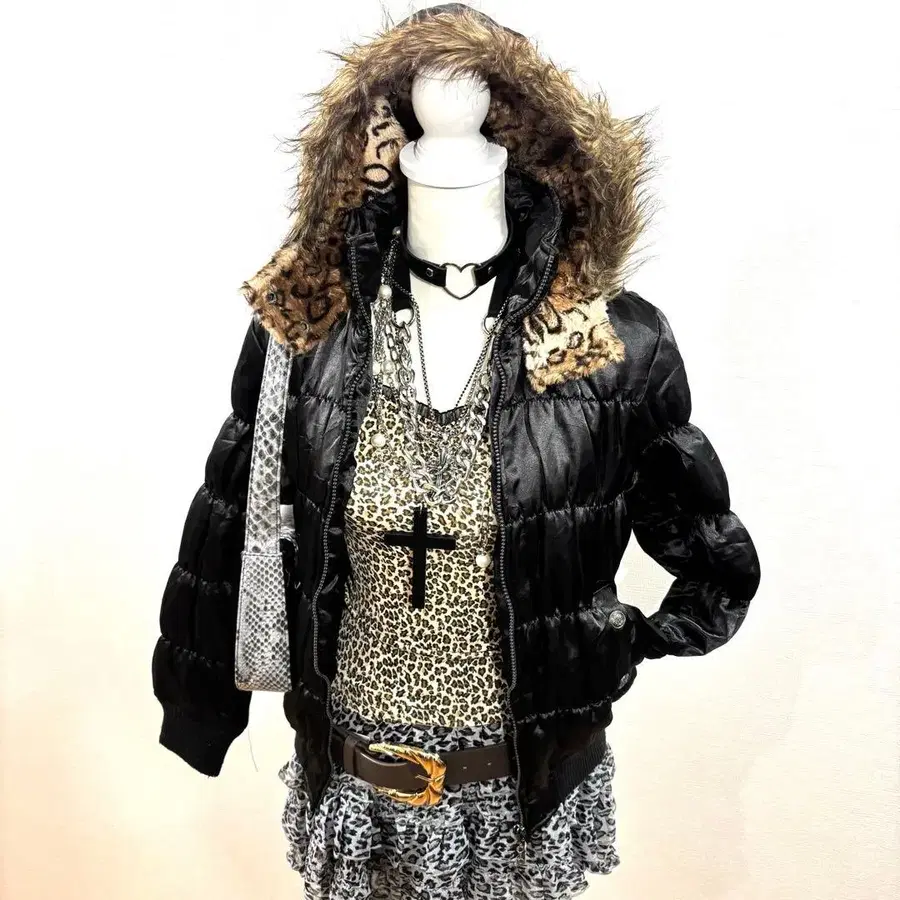 ◯ 헤이세이 갸루 y2k 퍼 다운 자켓 광택 그런지 다크 코어 표범 무늬 짧은 기장 레오파드