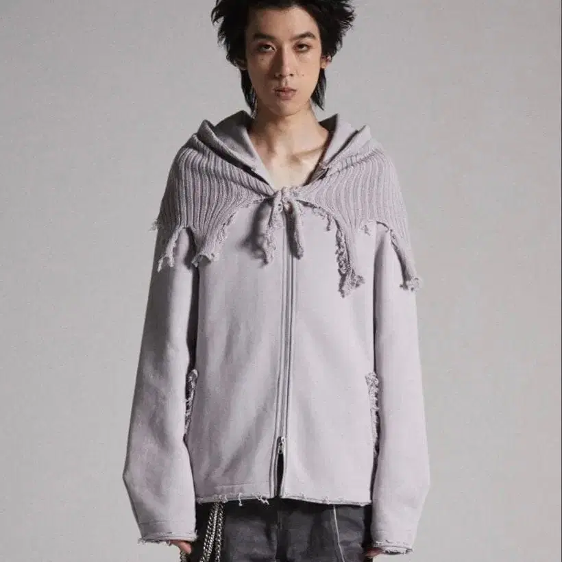 이종 소재 절개와 단처리, 데미지 가공을 조합한 GRANCY만의 엣지 있는 집업 후디입니다.
