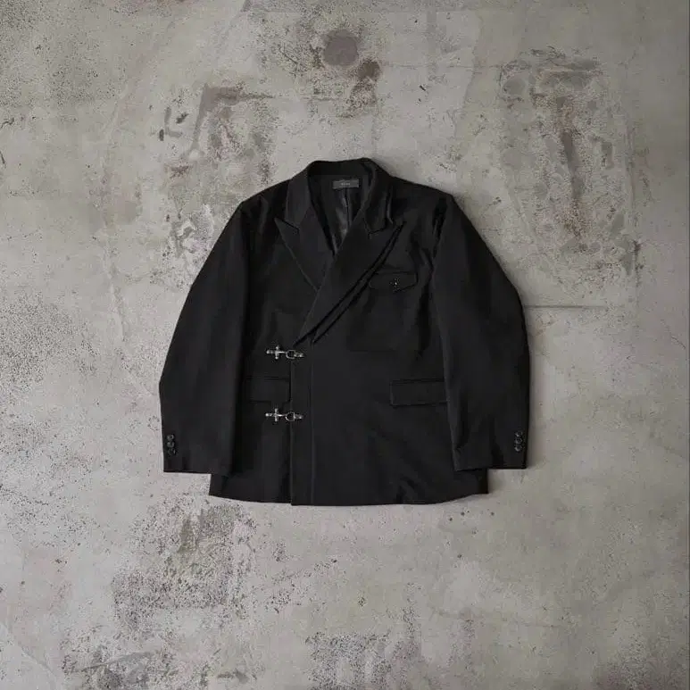 피크드 라펠의 더블 자켓을 베이스로, 앞면부 상단이 계산된 밸런스로 2중이 된 레이어드 사양입니다.