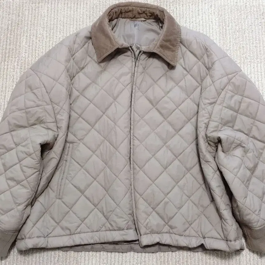 베이지 색상의 퀼팅 자켓, 코듀로이 옷깃 부착으로 캐주얼 스타일에 최적.
