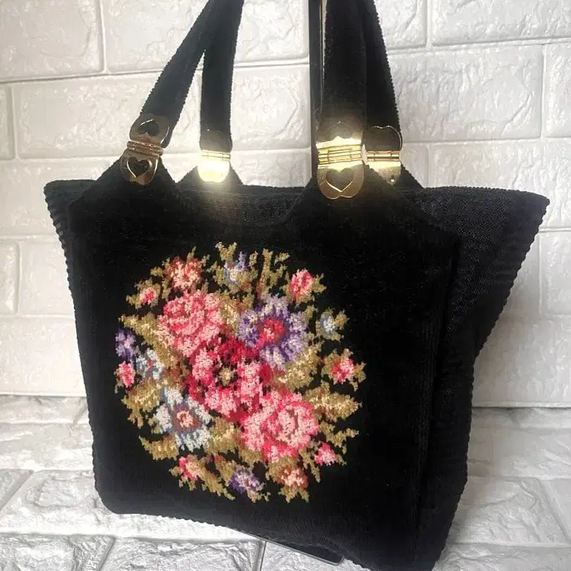 자동 번역되었어요. 원문보기블랙 패브릭 소재 핸드백, 꽃무늬 자수 디자인, 골드 금장 장식 포함.
