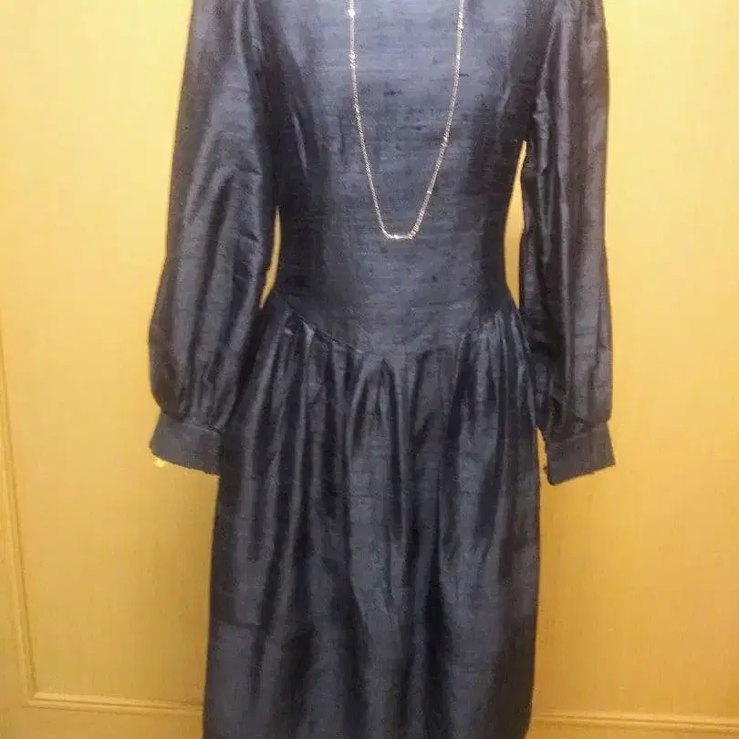 자동 번역되었어요. 원문보기광택 있는 블랙 긴팔 원피스, 플레어 스커트 디자인.