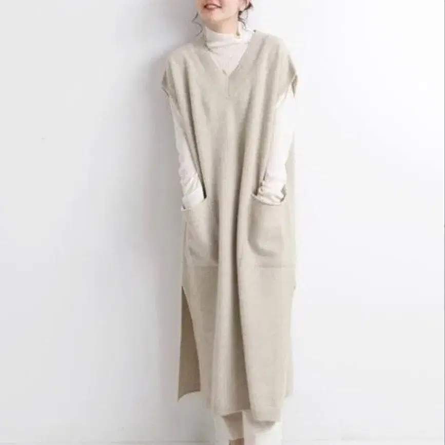 V넥 디자인의 베이지 슬리브리스 롱 원피스, 포켓이 있어 캐주얼한 스타일입니다.