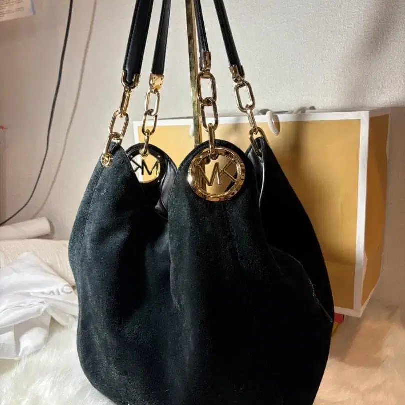 마이클코어스 스웨이드 숄더백 블랙 체인 MK 로고 금장 장식 숄더