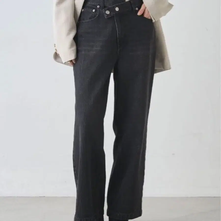 허리의 비대칭 디자인이 특징인 데님 팬츠.
