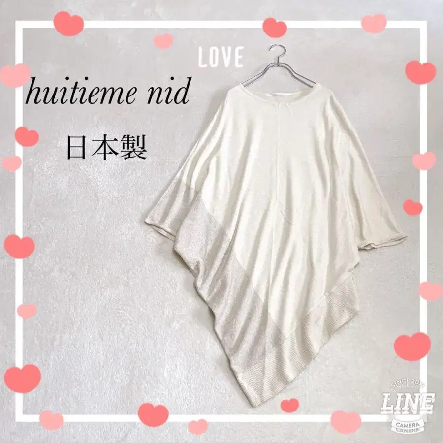 아이보리 색상의 비대칭 실루엣 니트탑, 라운드넥 디자인.