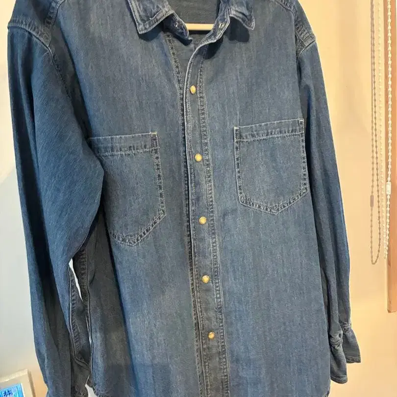 데님 소재의 인디고 블루 셔츠입니다. 버튼과 포켓이 있으며, 백 개더가 특징입니다. 옷깃에 부드러운 와이어가 들어 있어 스탠드 칼라 등으로 자유롭게 모양을 어레인지할 수 있습니다 ✨ 원단이 부드럽고 적당한 두께감이라, 슬리브리스 원피스 위에 겉옷으로 걸치거나, 올 시즌 착용 가능합니다 ✨ - 브랜드: L.E.JAMES - 소재: 데님 - 디자인: 버튼 포함, 포켓 있음 - 스타일: 백 개더 - 색상: 인디고 블루 방문해 주셔서 감사합니다. 한 번만 원피스 겉옷으로 소매를 걸쳤습니다.