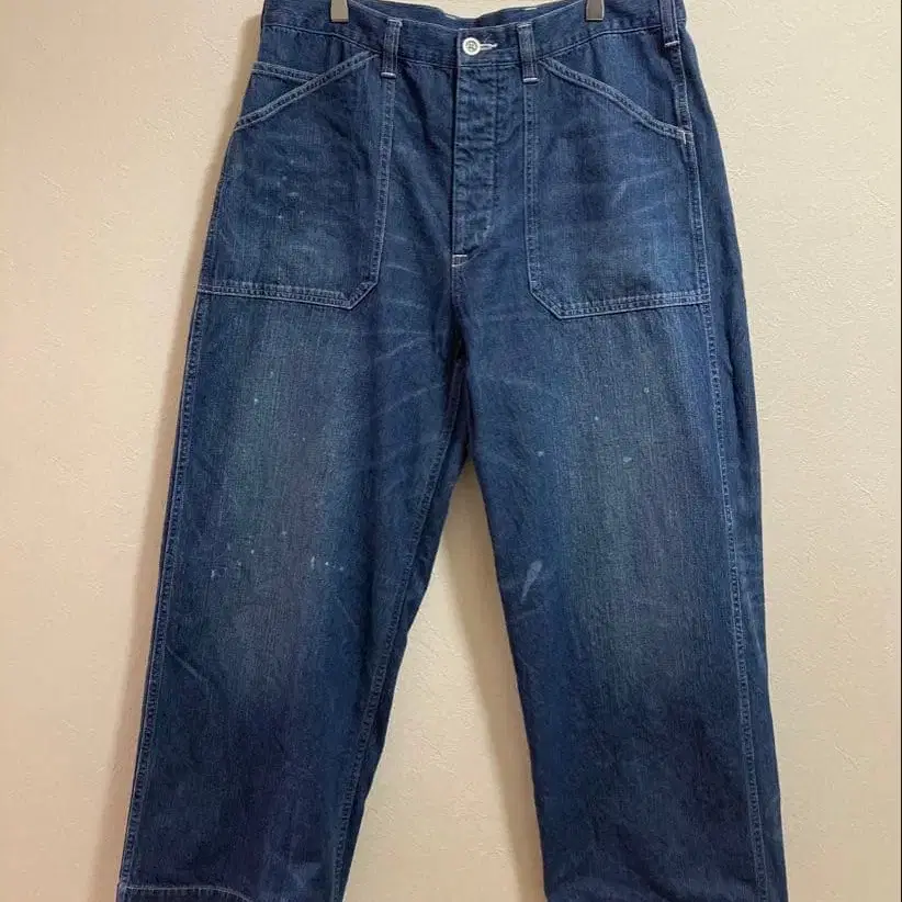 페인트 흩뿌림이나 스텐실 등의 가공을 더해 완성한 워크 팬츠.