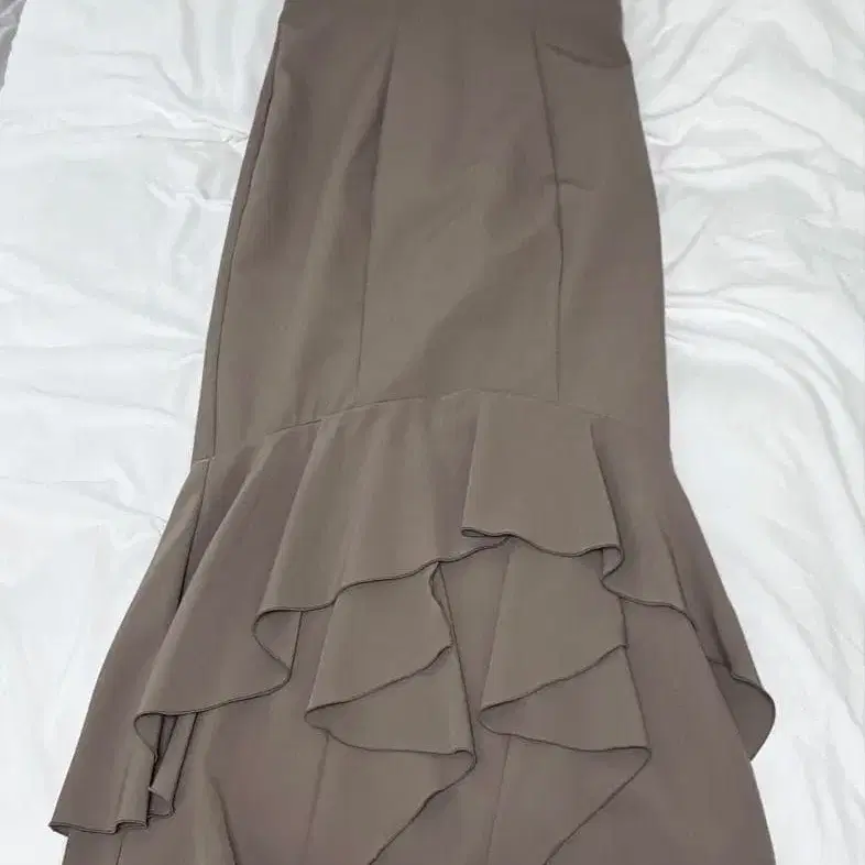 프릴 디자인의 브라운 타이트 스커트, 부드러운 원단으로 쾌적한 착용감.