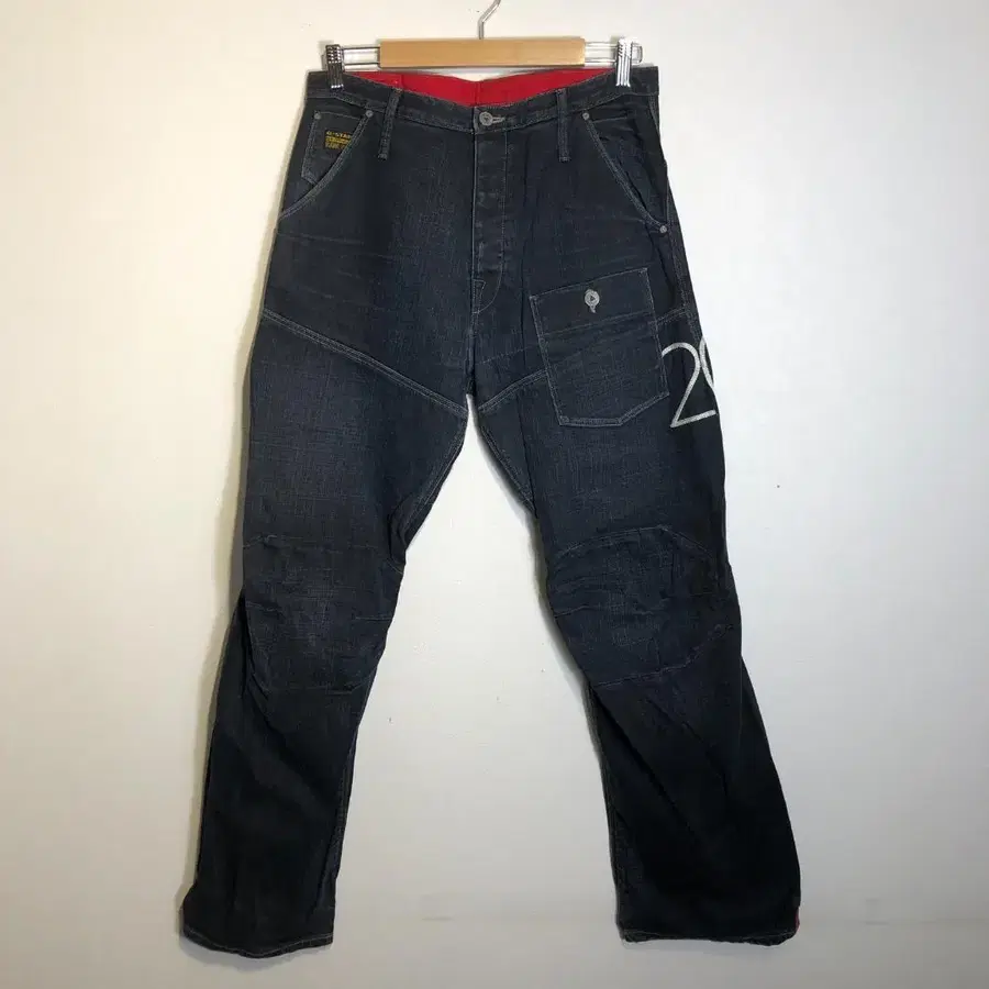 자동 번역되었어요. 원문보기다크 데님 스트레이트 팬츠, 빨간색 안감 부착 허리 밴딩과 포켓 디자인이 특징.