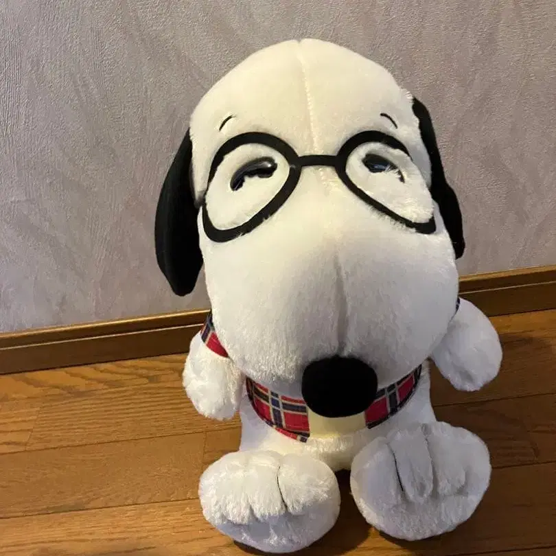 안경을 쓰고 체크 무늬 셔츠와 나비 넥타이를 착용한 멋쟁이 스누피입니다.