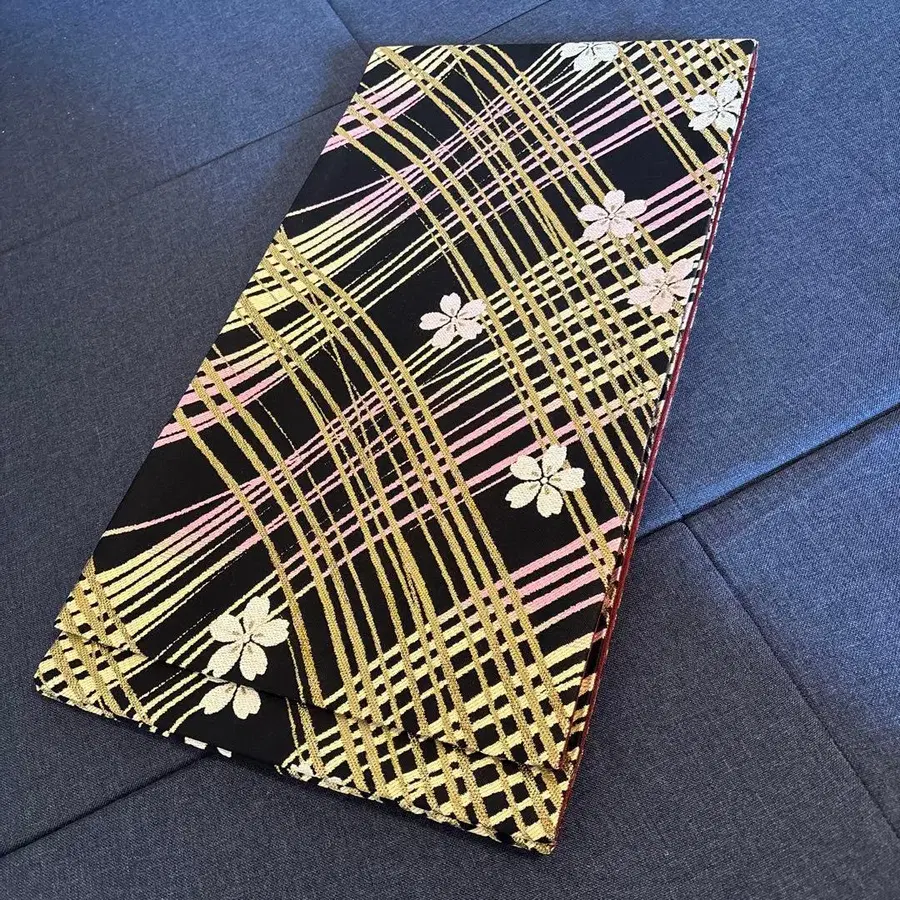 자동 번역되었어요. 원문보기블랙 베이스에 금색과 핑크색 꽃무늬가 들어간 후쿠로 오비.