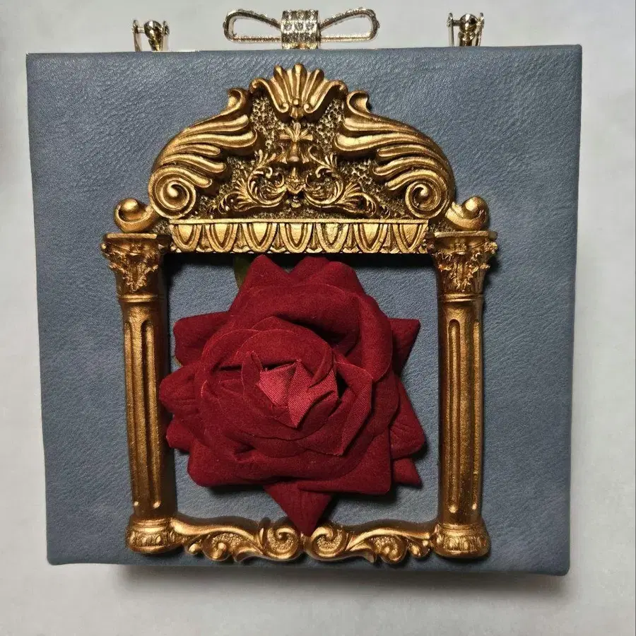 골드 컬러 프레임과 빨간색 장미가 특징인 백. - 색상: 그레이 - 장식: 골드 컬러 프레임과 빨간색 장미 - 손잡이: 골드 컬러 체인 핸들 방문해 주셔서 감사합니다.