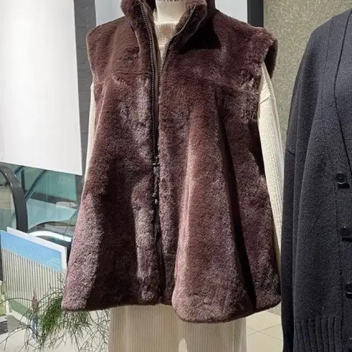 • 새상품 미사용 인조 모피 롱 베스트 다크 그레이