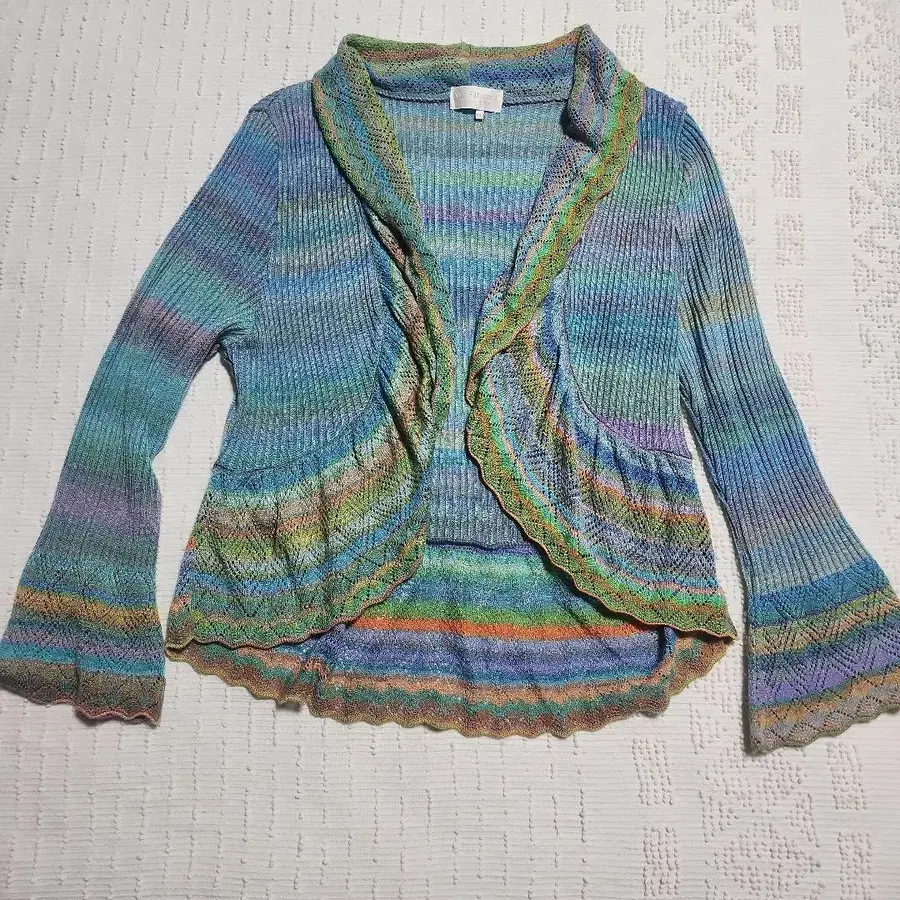 자동 번역되었어요. 원문보기다채로운 색감과 플레어 슬리브 디자인이 특징인 니트 가디건입니다. 버튼이 없는 볼레로 타입입니다.