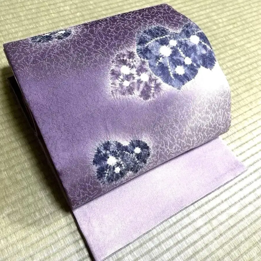 ★ 부드럽고 매기 쉬운 북 패턴의 나고야 오비입니다. ★ 은사가 짜여진 아름다운 보라색 그라데이션 원단입니다. 잎사귀 패턴은 느슨한 絞り(시보리) 기법으로 되어 있습니다. ★ 길이 약 456cm, 폭 31cm ★ 깨끗한 상태입니다. 잘 사용해 주시면 감사하겠습니다.
