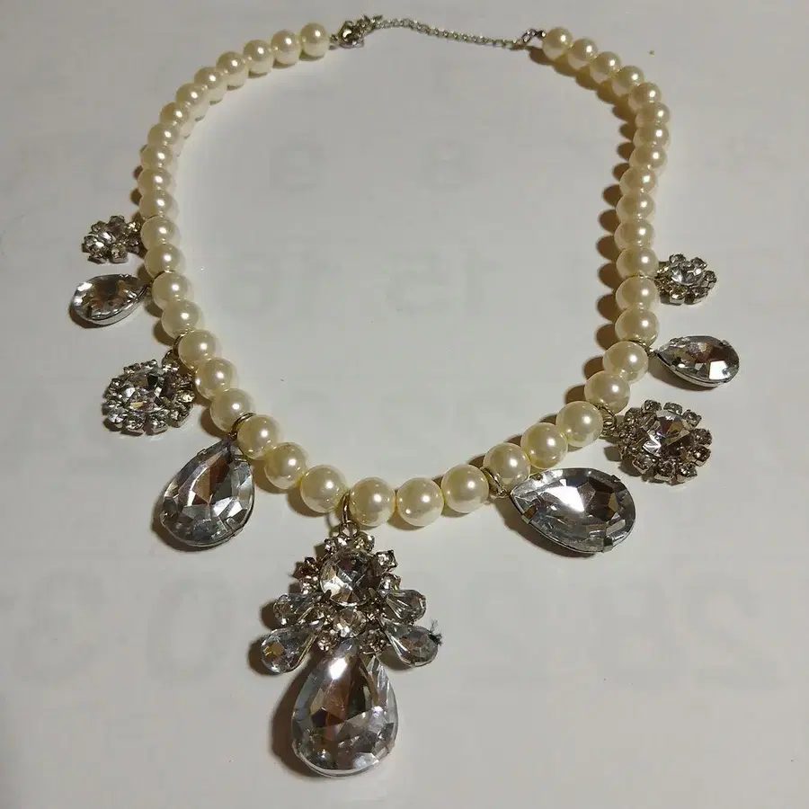 이것은 에모다의 페이크 펄 목걸이입니다. 펄에 여러 가지 스톤이 붙어 있어 멋집니다. 전체 길이는 조절 부분을 제외하고 약 40cm, 조절 부분은 약 8cm입니다. 개인 측정이기 때문에 약간의 오차는 양해 부탁드립니다. 구매했을 때 받은 봉투에 넣어 발송해 드리겠습니다.