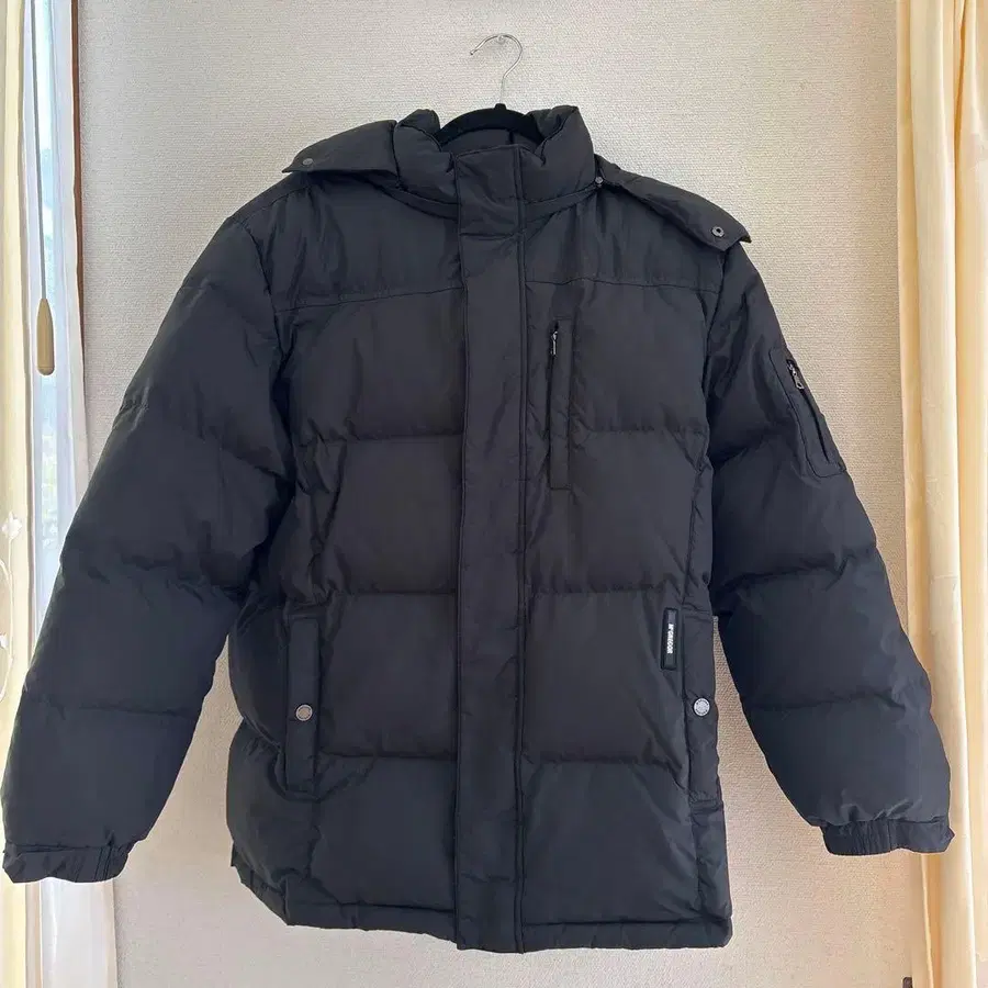자동 번역되었어요. 원문보기탈부착 가능한 후드가 달린 블랙 다운 자켓.