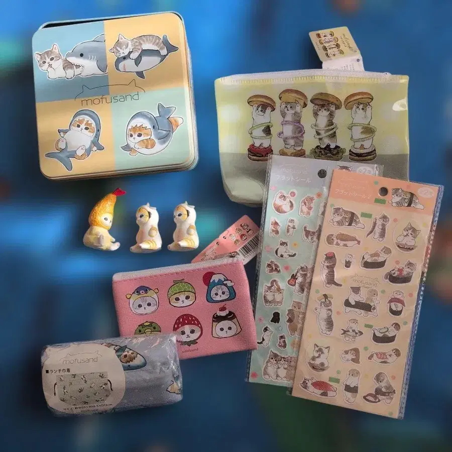 mofusand 굿즈 세트입니다. 캔, 파우치 2종, 런치 복조리, 플랫 씰 2종, 피규어 2종 3개의 세트입니다. 캔이 필요 없으신 분은 가격 인하 가능합니다. 즉시 구매 OK 흡연자, 반려동물은 없습니다.