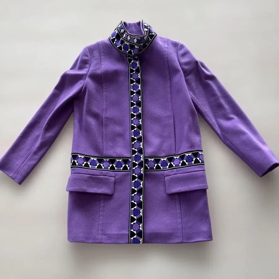 자동 번역되었어요. 원문보기라일락 퍼플 색상의 노카라 자켓으로, 스트라이프 패턴의 안감이 특징입니다.