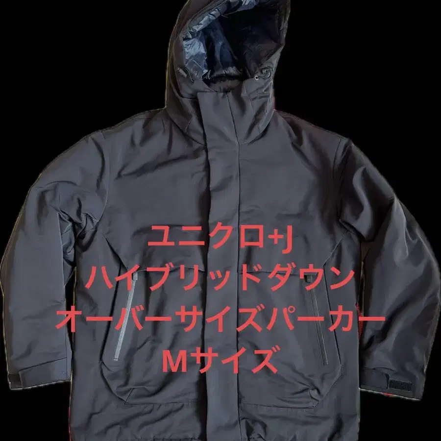 UNIQLO +J의 하이브리드 다운 오버사이즈 파카, M 사이즈, 블랙 컬러의 스타일리시한 디자인.
