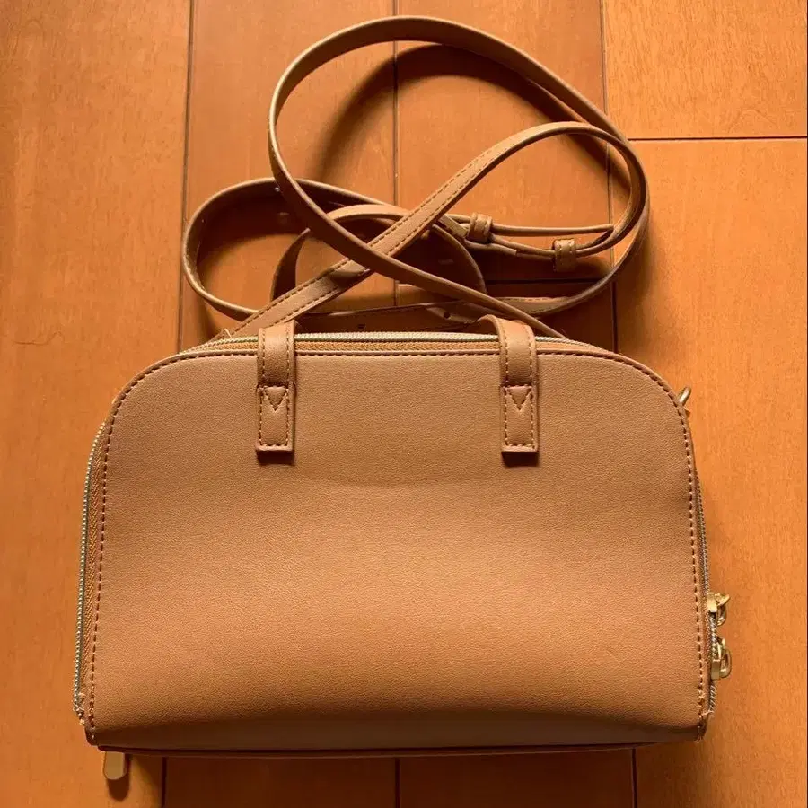 합성 피혁 소재의 베이지색 숄더백, 지퍼 개폐로 사용하기 편리한 디자인.