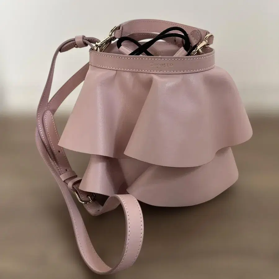 자동 번역되었어요. 원문보기레페토의 프릴 디자인 핑크 가죽 숄더백, 조정 가능한 스트랩 포함.
