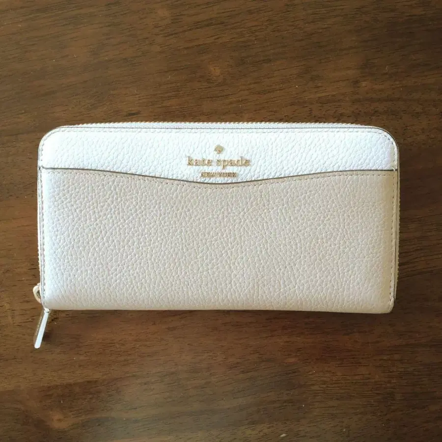 가죽 소재의 베이지와 화이트 색상 장지갑, kate spade의 심플하고 엘레강트한 디자인.