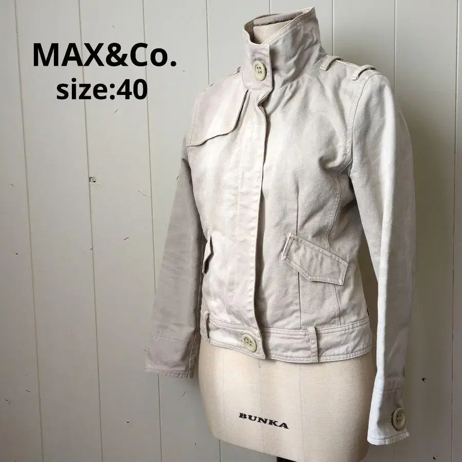 디자인: 목 부분을 확실하게 커버하는 스탠드 칼라(스탠딩 칼라) 사양. 큰 버튼이 악센트가 된, 도시적인 밀리터리 테이스트의 디자인입니다.