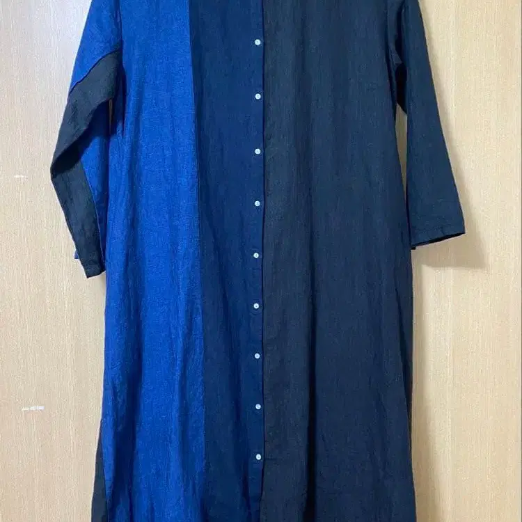3가지 색상의 절개가 멋진 천연 소재(린넨)의 긴팔 원피스입니다.