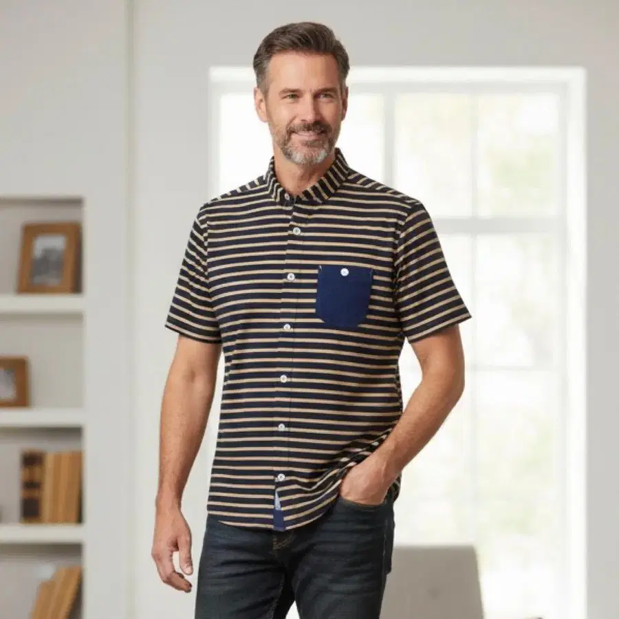 새상품 MITSUMINE 미츠미네 네이비 보더 셔츠 L 반팔 남성용