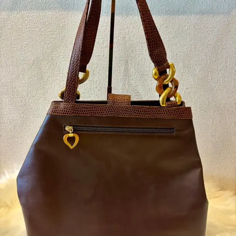 핸들 부분의 골드 체인 금장 장식과 뒷면 포켓의 하트 모양 지퍼 참이 악센트가 되어 레트로하고 클래식한 분위기가 매력적입니다.