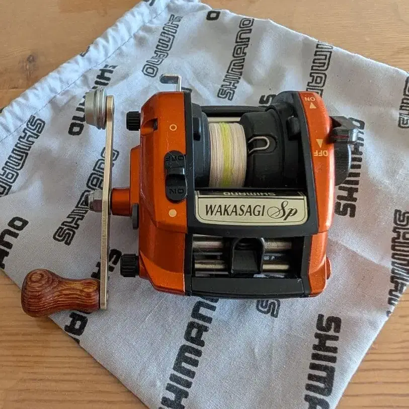 오렌지 컬러 WAKASAGI SPGT 모델 빙어 릴, 전용 주머니 포함. - 모델명: WAKASAGI Special GT - 색상: 오렌지 - 부속품: 전용 주머니 낚시 용품 정리를 위해 판매합니다. 기능상 문제없이 사용할 수 있습니다. 상자나 사용설명서는 없으며, 전용 주머니가 포함됩니다. 또한 사진과 같이 PE 라인이 감긴 채로 발송합니다. (아마도 0.1호였던 것 같습니다)