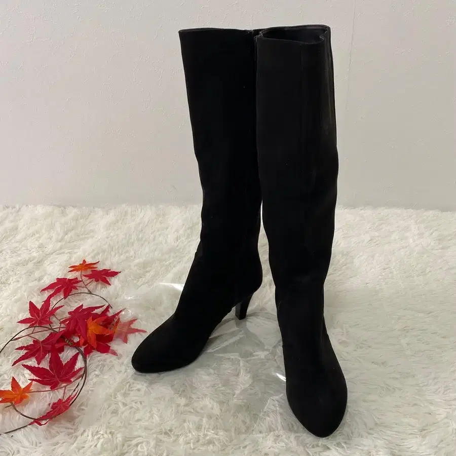 스웨이드 소재의 블랙 롱 부츠, 중간 굽으로 스타일리시한 디자인.