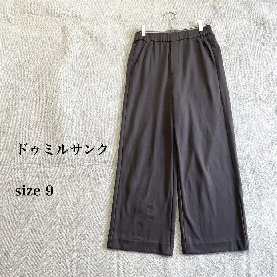 허리밴딩으로 편안한 다크 브라운 와이드 팬츠, 사이즈 9, 포켓 부착.