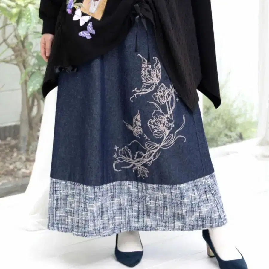 [이즈] 라메 트위드 절개 꽃 나비 자수 데님 스커트