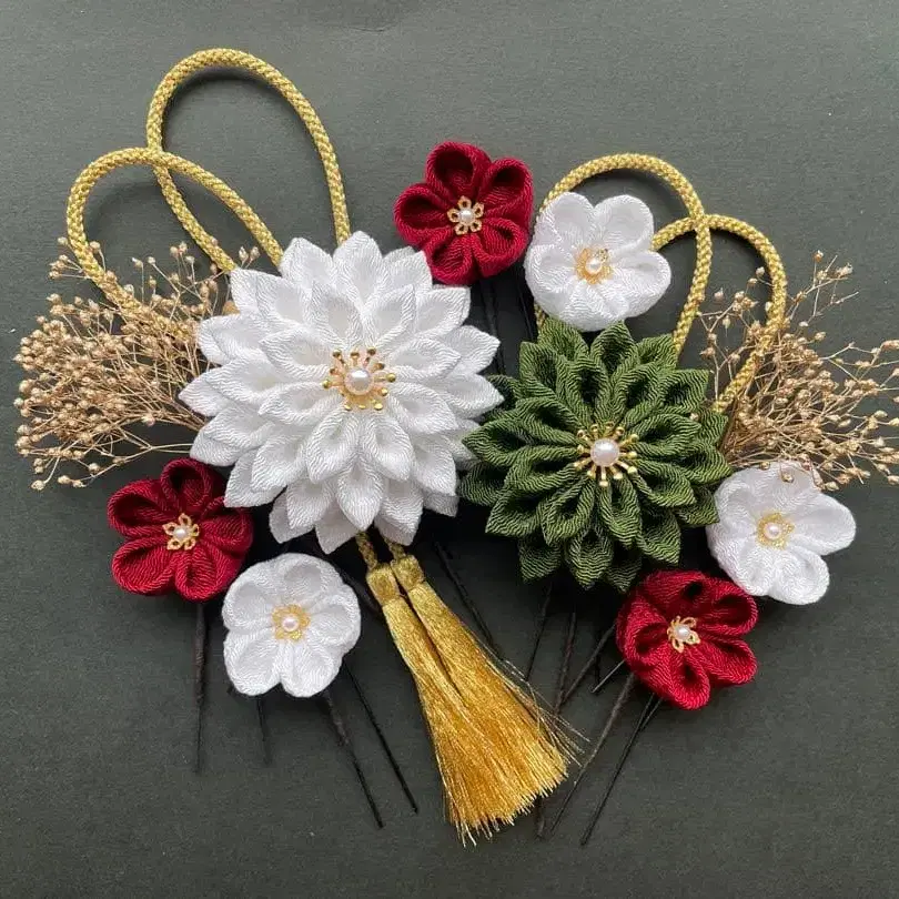 #츠마미자이쿠 #크레이프원단공예 #크레이프원단 #머리장식 #헤어액세서리 #일본의류 #기모노 #성인식 #졸업식 #졸업식 #입학식 #입학식 #결혼식 #시치고산 #유카타 #기모노 #경사 #브라이덜 #웨딩 #화이트 #골드 #빨간색 #핸드메이드 #수제 #일본잡화 #일본 #후리소데 #하카마