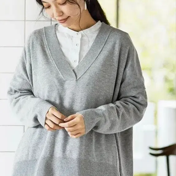 약간 가는 12 게이지로 편직한 [ 사각 스웨터 ] . 감연사(甘撚りの糸)를 사용하여 부드럽고 자연스러운 질감을 표현했습니다. 크게 단차를 둔 헴라인과 깊게 파인 V넥이 포인트입니다.