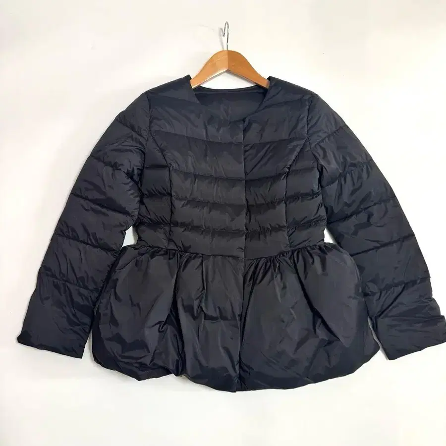 허리 높은 위치에서 퍼지는 페플럼 라인이 페미닌한 무드를 자아내는 다운 자켓.