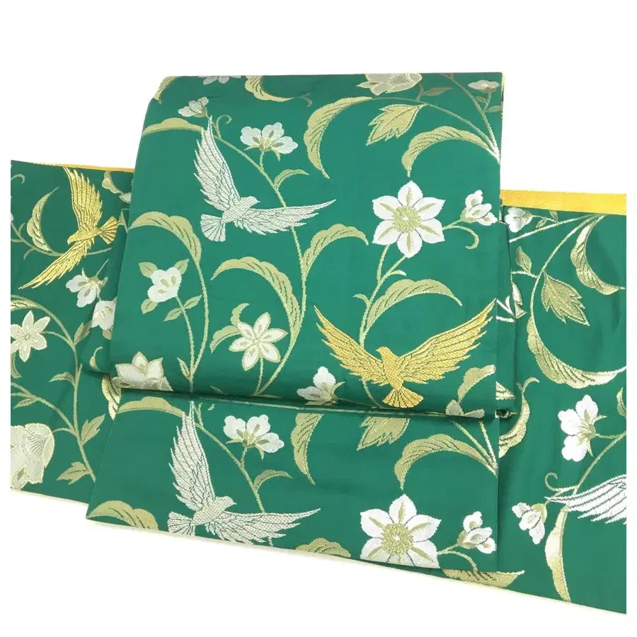순수 실크 라쿠 오비 후쿠로 오비 그린 새 문양 이중 북 만들기 오비 입니다.