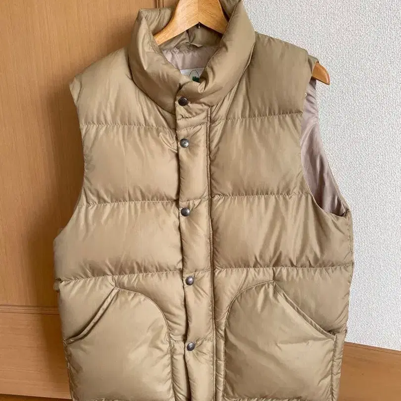 빈티지 탄 색상의 다운 베스트, 앞 포켓 포함, 사이즈 USA S / JPN M.