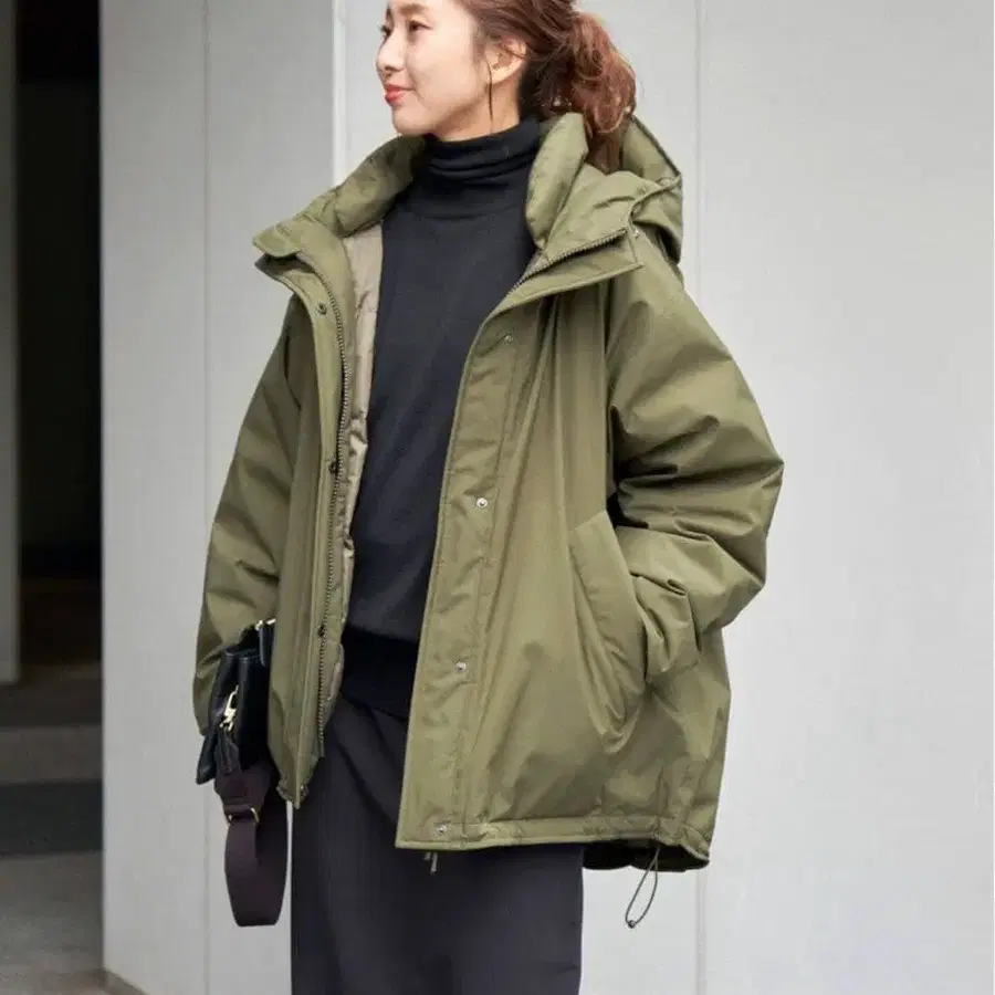 카키 발수 후디드 다운 하프 코트 후드 부착