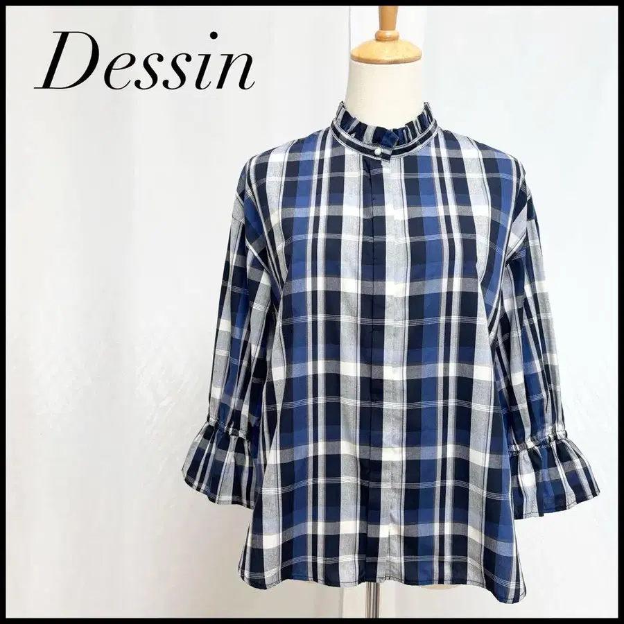 [거의 미사용] 데셍 긴팔 셔츠 노카라 벨 슬리브 체크 네이비 S