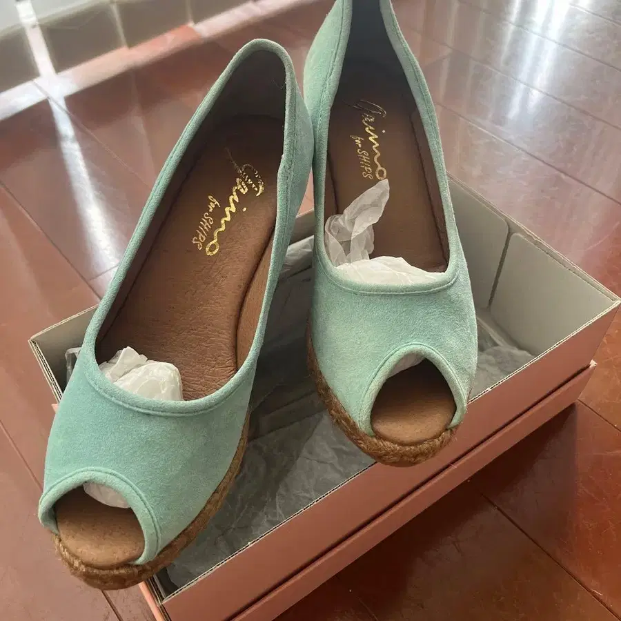 가이모 에스파드리유 민트 그린 오픈토 웨지 샌들 박스 포함