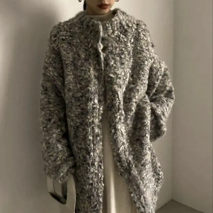 울퉁불퉁한 표정이 특징인 니트 자켓입니다.